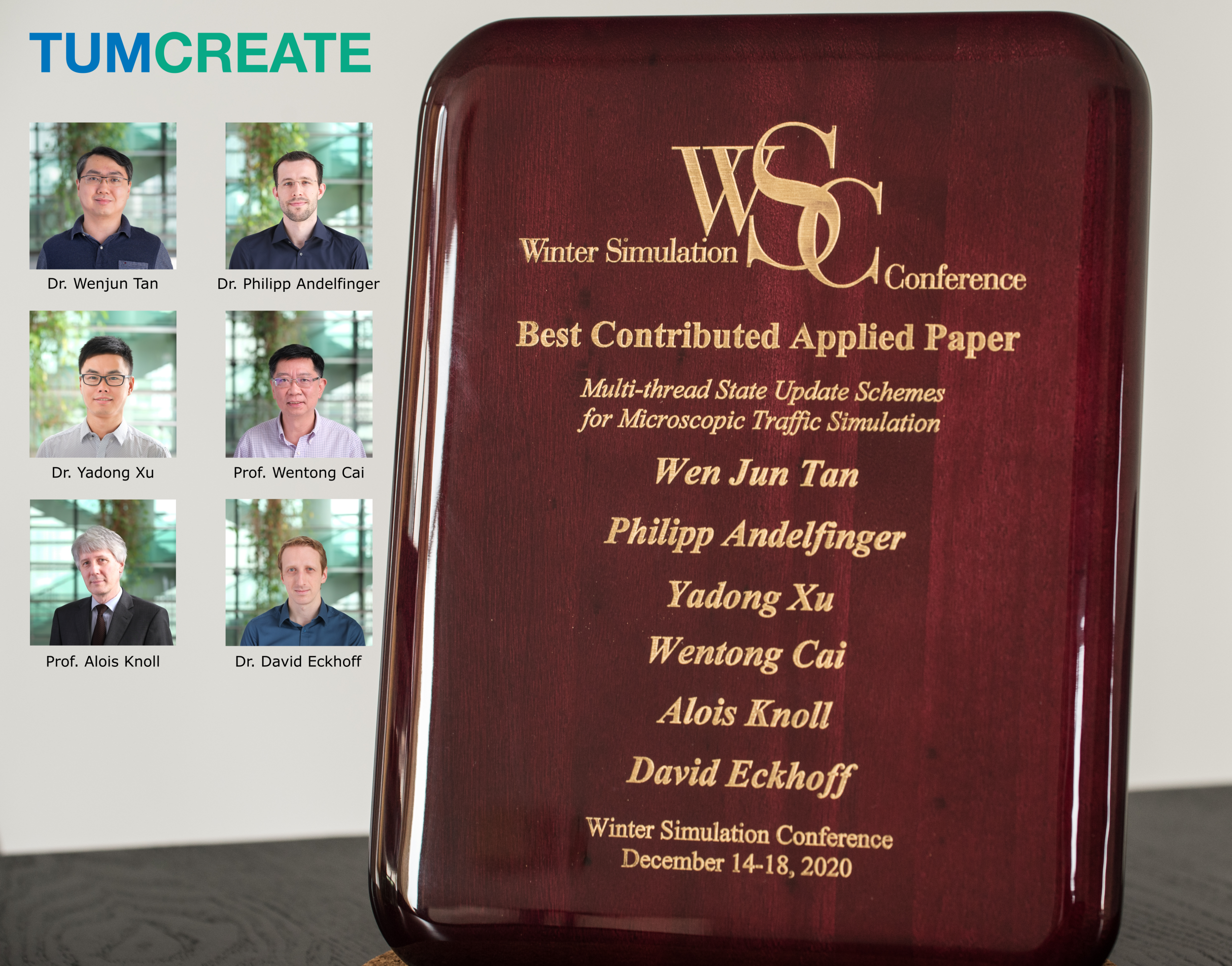 Together with my colleagues Wenjun Tan, Yadong Xu, Philipp Andelfinger, Wentong Cai and Alois Knoll we won the Best Contributed Application Paper Award at the Winter Simulation Conference (WSC 2020) conference. WSC recognizes contributed papers of exceptionally high quality and implements a stringent process in selecting the winners. Out of 200 accepted contributed papers, four finalists were selected by the track committee. Among the four finalists, the winner was eventually selected by an independent panel of three distinguished members of the simulation community. This academic achievement is a high recognition for the research work by the authors in the simulation field. The paper discusses how in a simulation (e.g., traffic), agents (e.g., vehicles) are advanced in time such that the reproducibility and scalability of the simulation can be supported. This is a critical aspect to address in high-performance simulations where hundreds of thousands of agents are simulated in parallel. The research has already been incorporated into TUMCREATE’s city-scale simulator CityMoS, which is being deployed in various research, government, and industry projects.