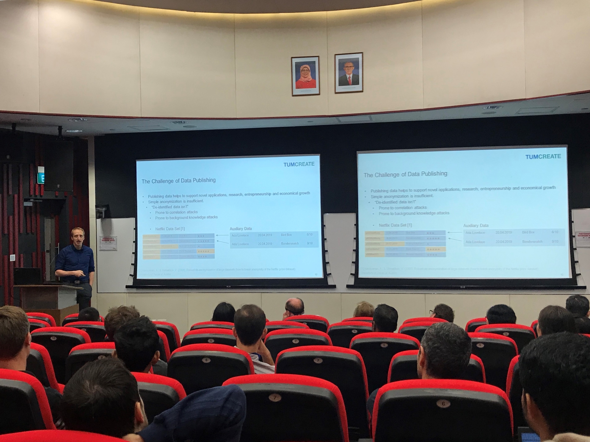 I was invited to speak at the monthly CREATE PI Seminar to share more on the topic – Privacy in the Smart City: Trade-off or Opportunity. I presented the various privacy challenges, that both data collectors and individuals face today, such as the increase of privacy protection which could reduce data utility for researchers and scenarios when individuals would lose their right to their own data. To further emphasize the importance of privacy, the risks of data publishing were highlighted. I showed the ways actual personal data could be obtained through data publishing, even with anonymization, which proved the danger of how the seemingly harmless, published data could be used against an individual. So, how can we continue to enjoy the convenience of new and improved technologies for a smart city without compromising our privacy wholesale? I went on to cite two possible ways in which an individual’s data can be protected – by enabling plausible deniability through differential privacy and by the use of synthetic datasets. I had a lot of fun giving this talk as I felt the topic is timely and the audience was interested, asking good questions in the Q&A session.